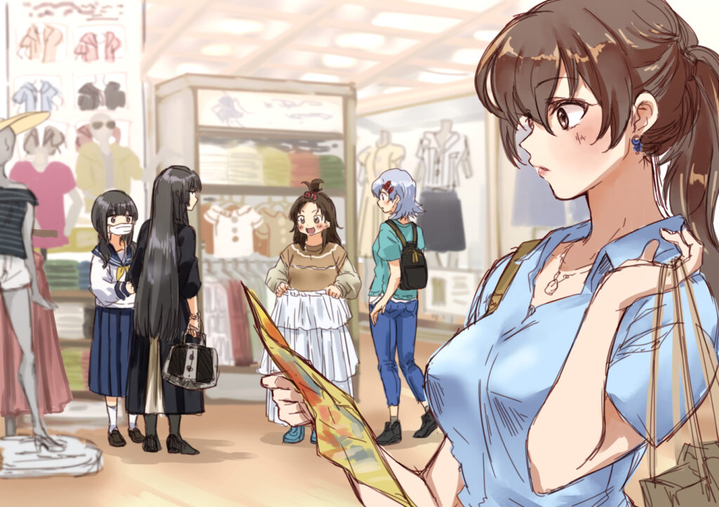 私服、なんとなく紅葉はパンツスタイル、茉莉子はスカート、由妃乃は黒い服、のイメージ。