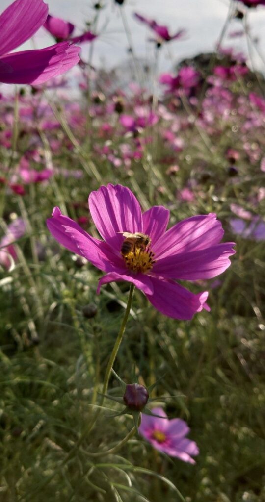 1枚目は、コスモスの周りにたくさんミツバチが蜜を取りに来ていたので、わたしなりにちょっとエモい感じに撮影してみました。